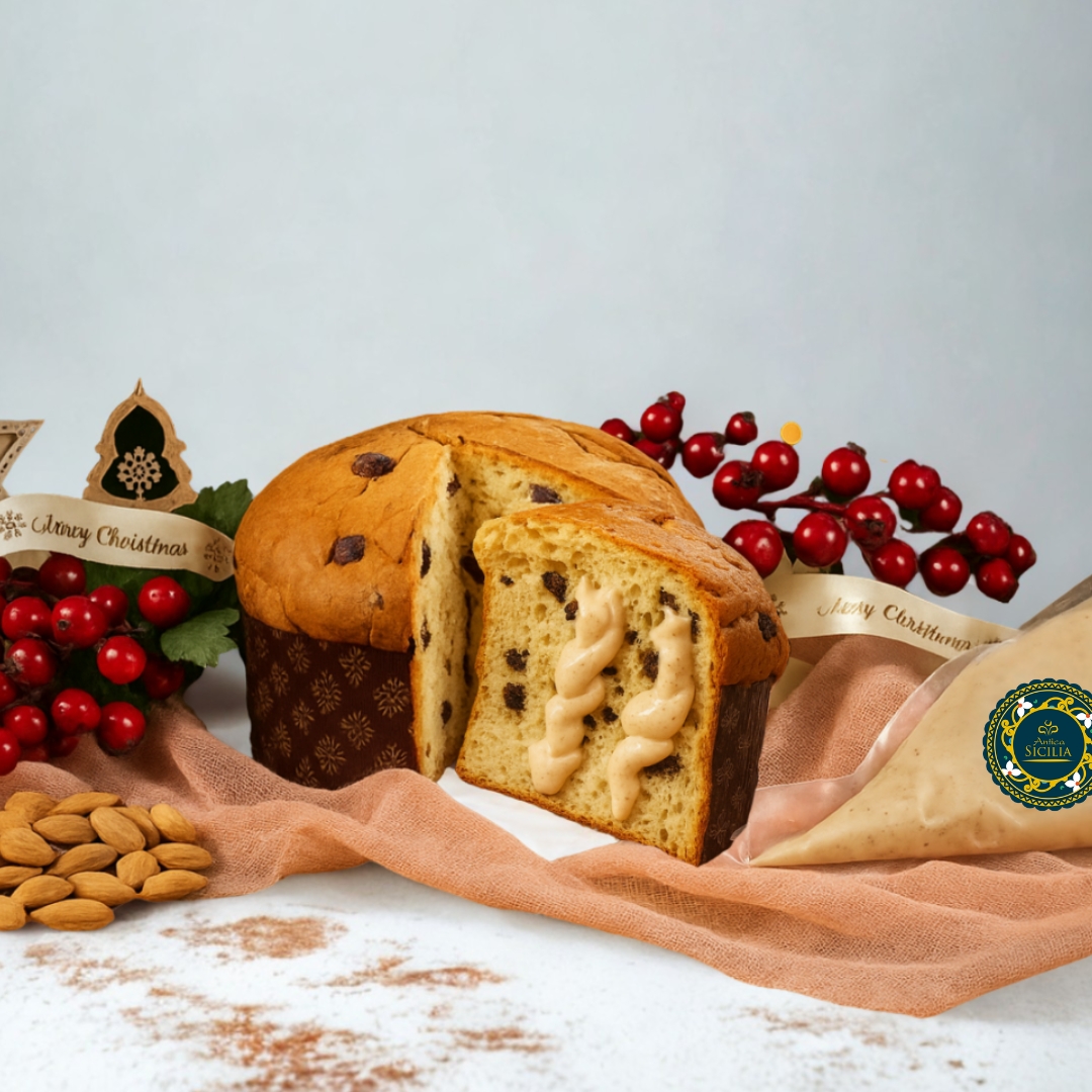 Box Panettone al Caramello Salato – Panettone gemaakt met Modica chocolade geleverd met een spuitzak met gezouten karamelcrème.