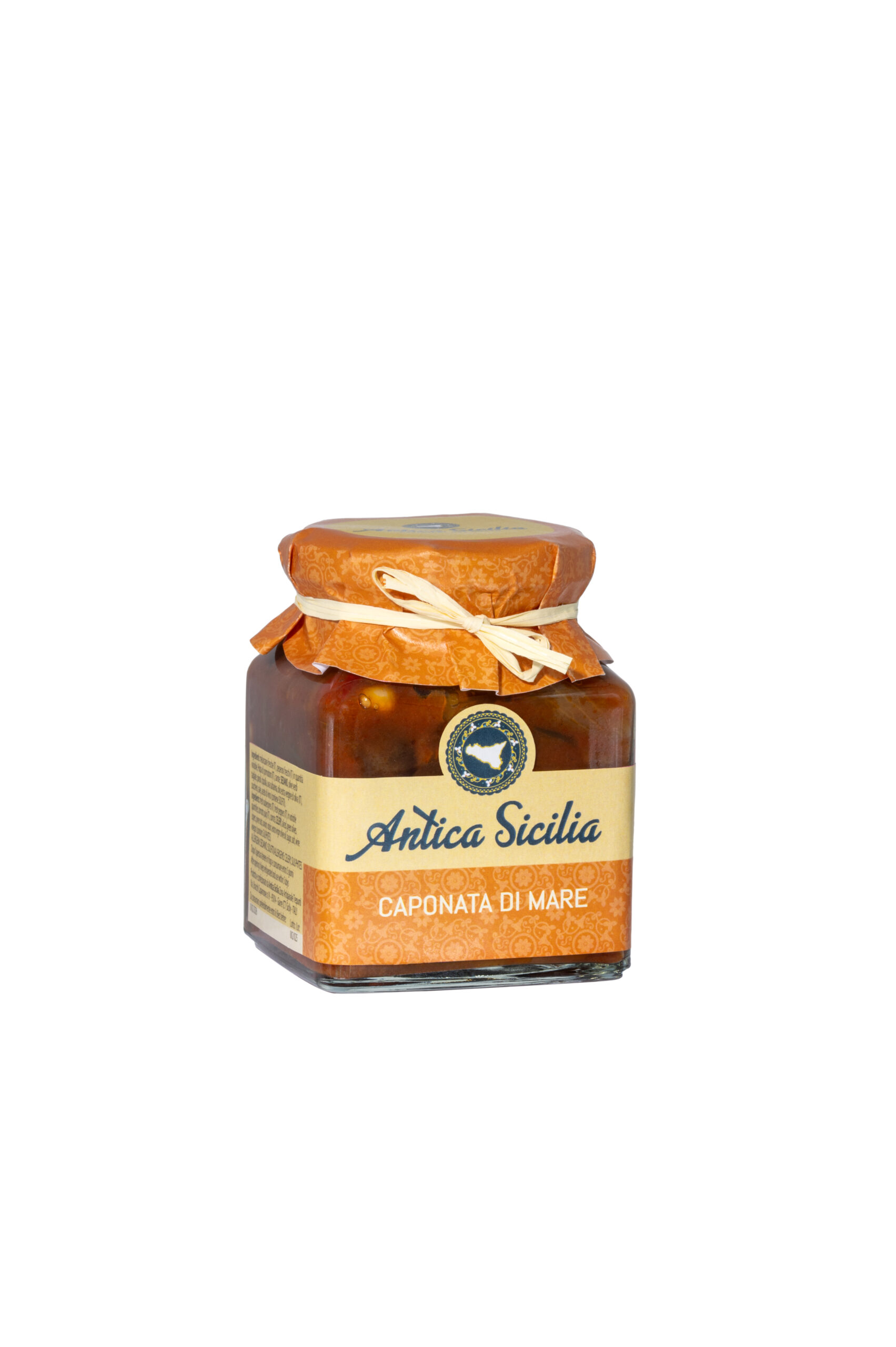 Ingrediënten: verse aubergine en paprika, gehakte tomaten, ui, selderij, wortelen, rozijnen, pijnboompitten, groene olijven, kappertjes, zwaardvis, garnalen, zout, wittewijnazijn, suiker, extra vierge olijfolie.