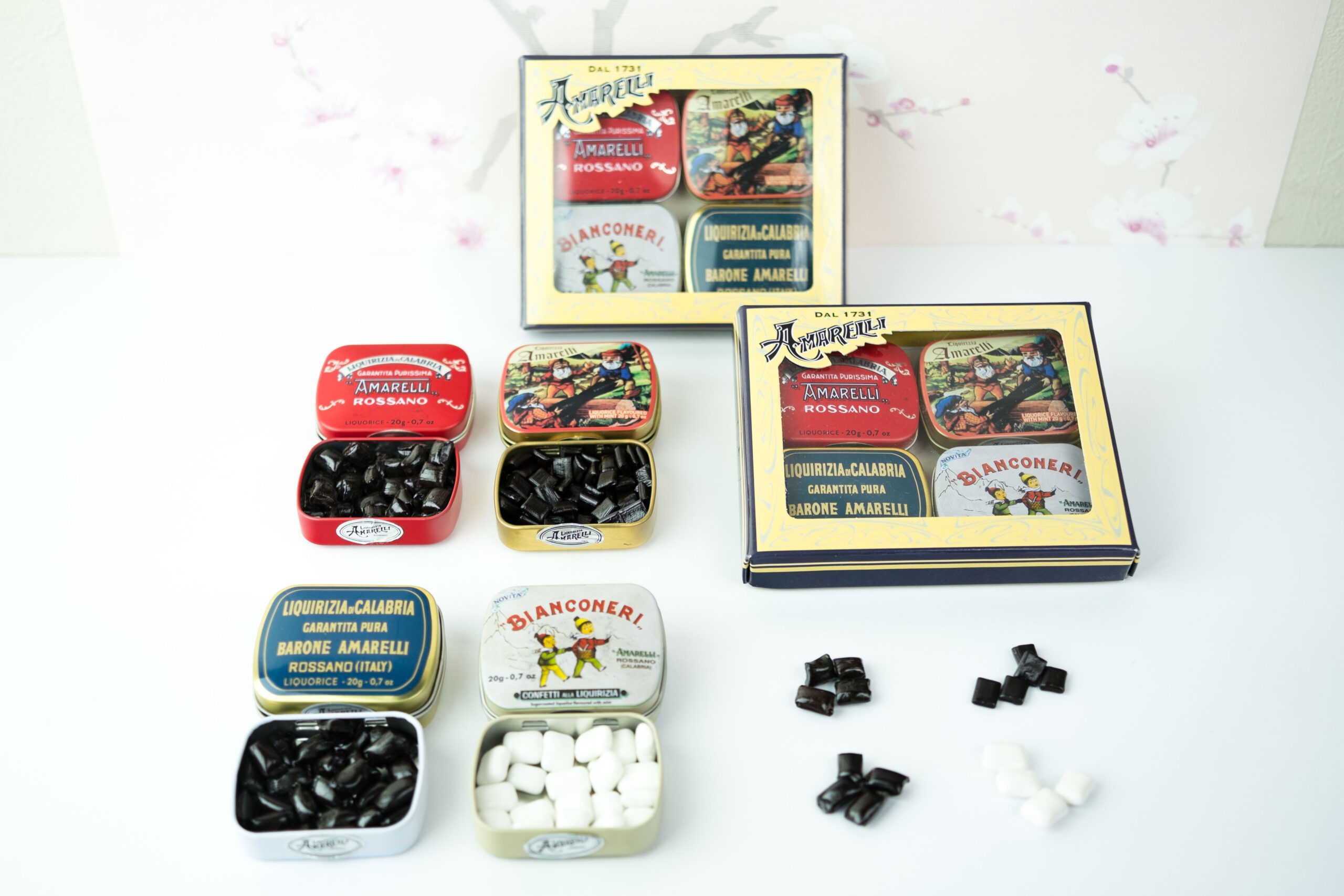 De verpakking bevat een blikje ROSSA, NANETTI, BIANCONERI en BARONE AMARELLI. Blikjes met pure zoethout-, mint- en gesuikerde dropjes.