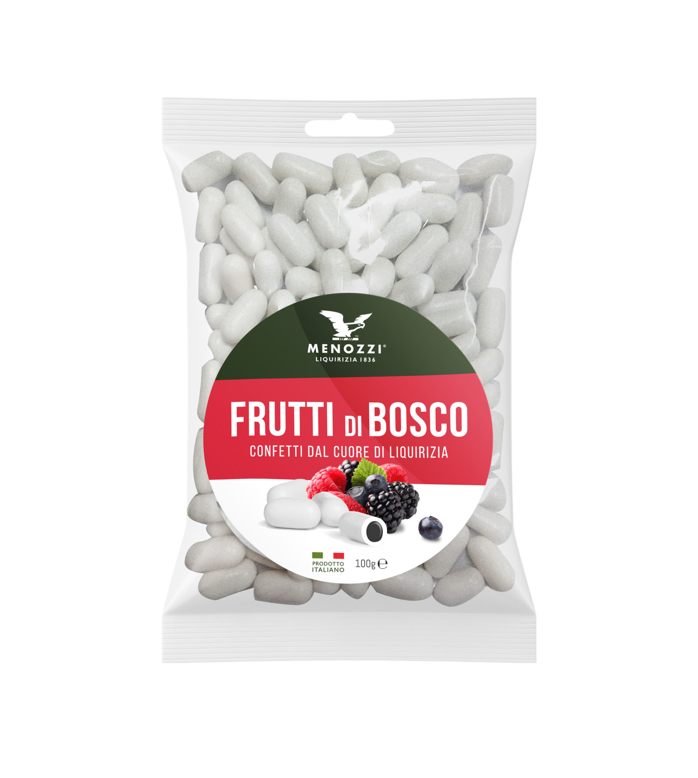 Confetti gusto frutti di bosco con anima di liquiriza in bustina plastica trasparente (100 g)