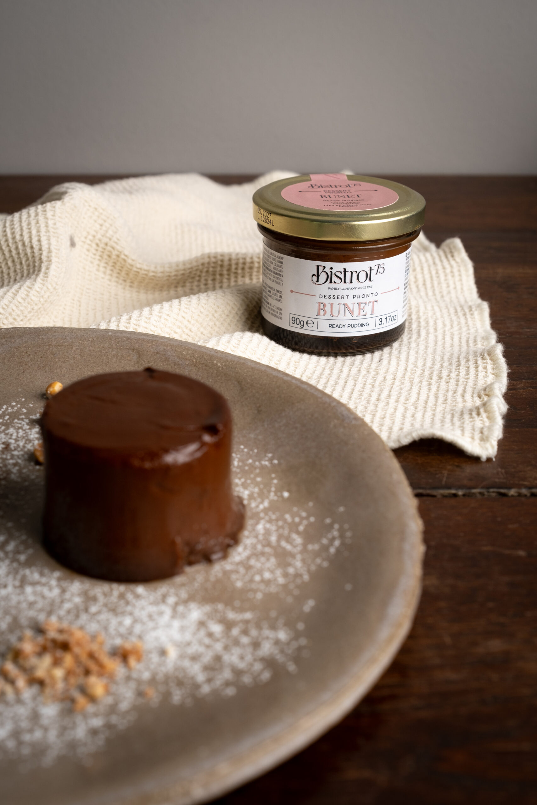 Dessert pronto BUNET, dolce Piemontese con cacao, amaretti e liquore all’amaretto – Piemontees dessert op basis van melk, eieren, cacao, amarettokoekje e amarettolikeur (90 g)