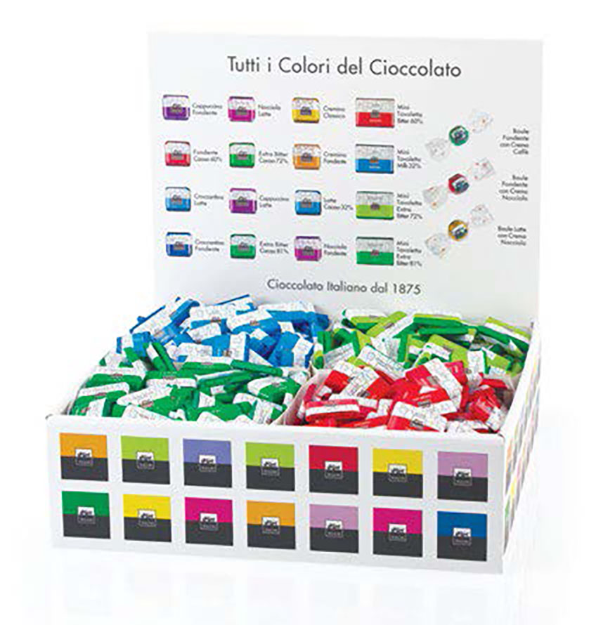 Espositore Mini Tavolette – Mix doos met vier soorten chocolaatjes; melkchocolade met 38% cacao en drie soorten pure chocolade met 68%, 76 en 86% cacao (6 kg aan chocolaatjes van 6 g per stuk)