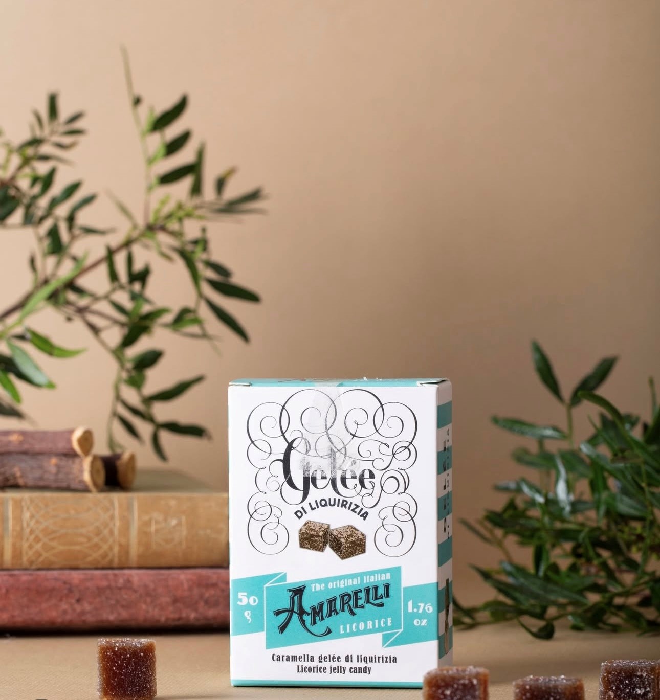 De display bestaat uit zoethout- en mandarijn-geleisnoepjes met een zacht en sappig hart omhuld met een dun laagje kristalsuiker.
