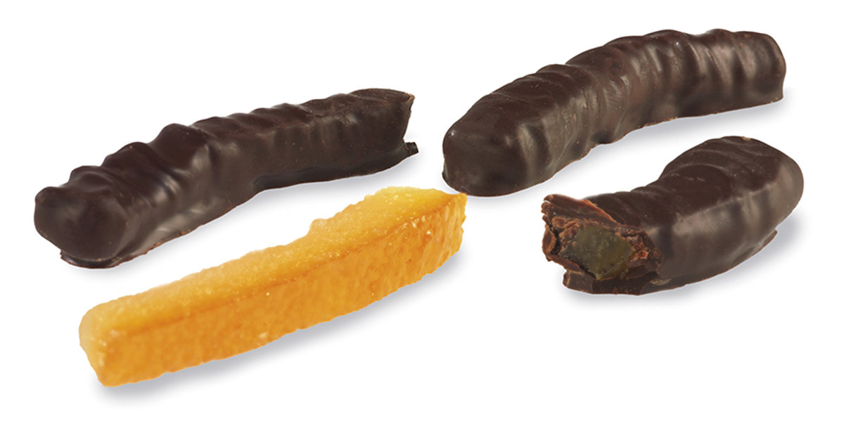 Filette di Arancia canditi, infusi in marasca e ricoperti di cioccolato fondente – Sinaasappelschil doordrenkt met marasquin met een lichte laag pure chocolade (3 kg)