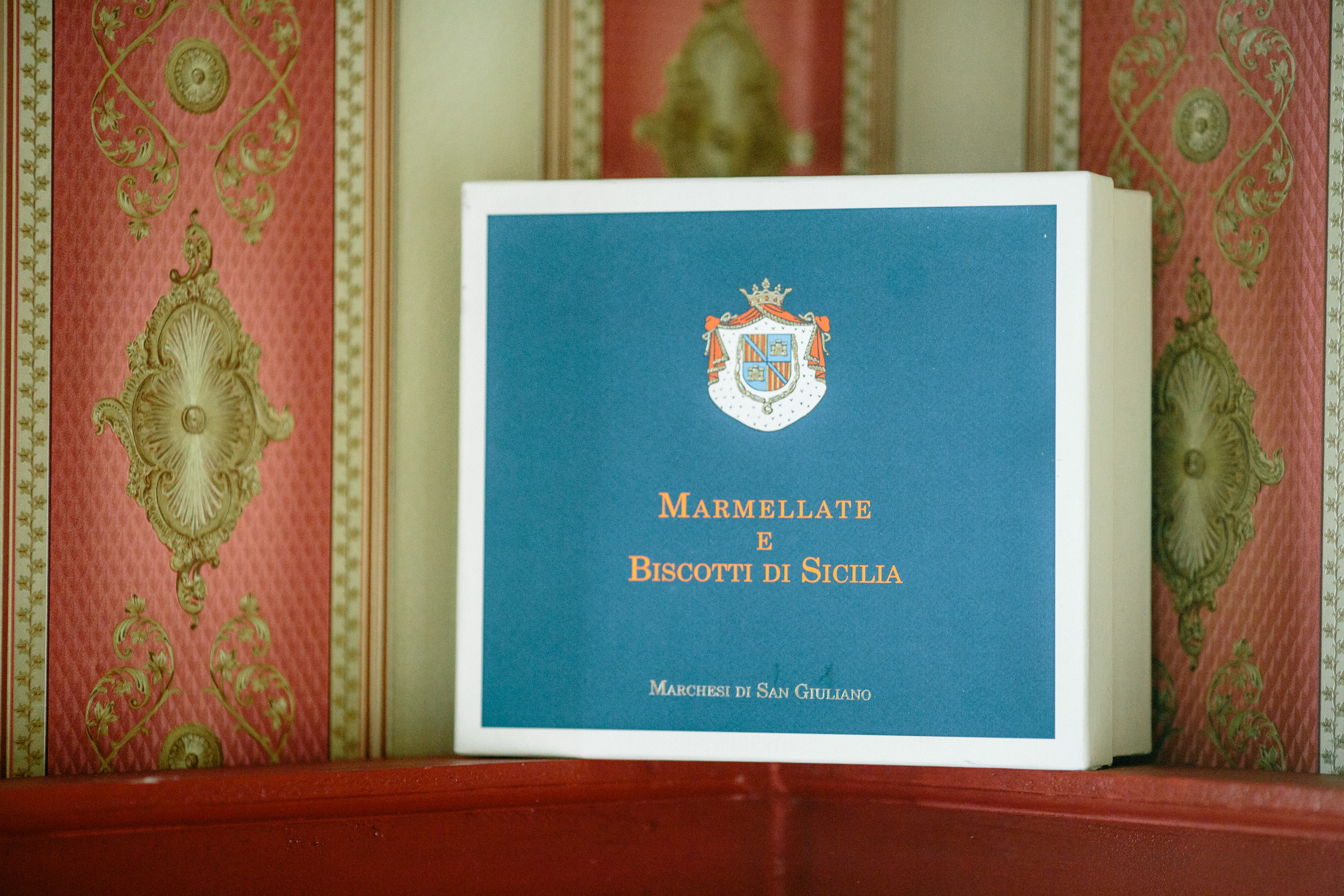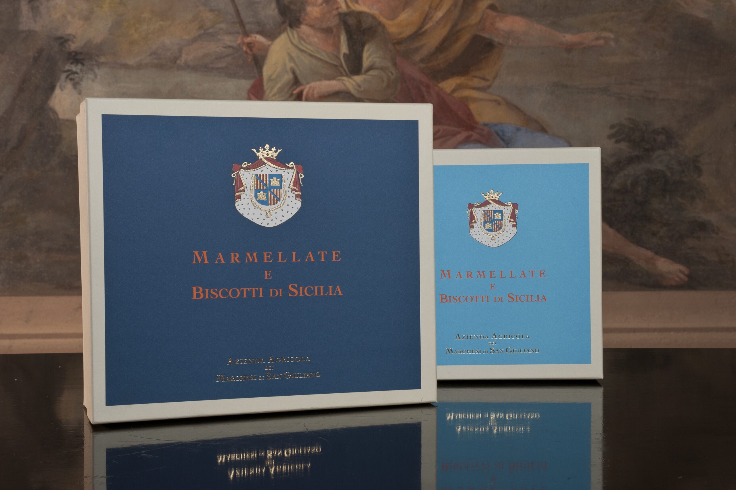 Verfijnde doos van hoogwaardig karton, blauw en crèmekleurig met gekleurd wapen.
