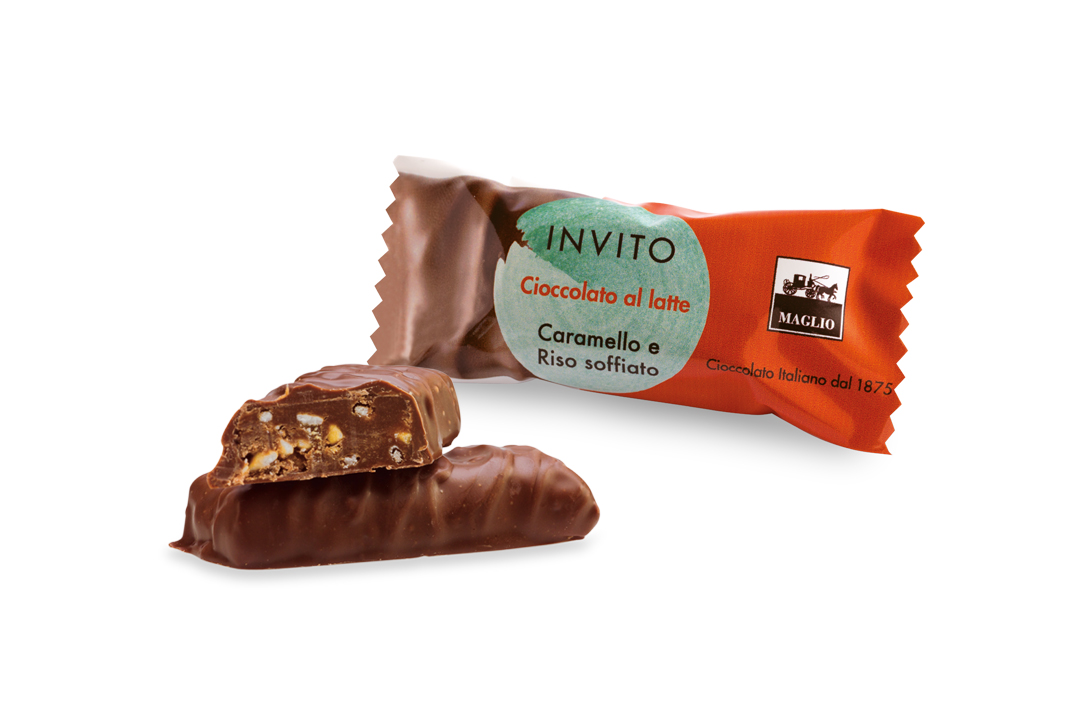 INVITO melkchocolade is gevuld met karamelcrème en knapperige gepofte rijst.