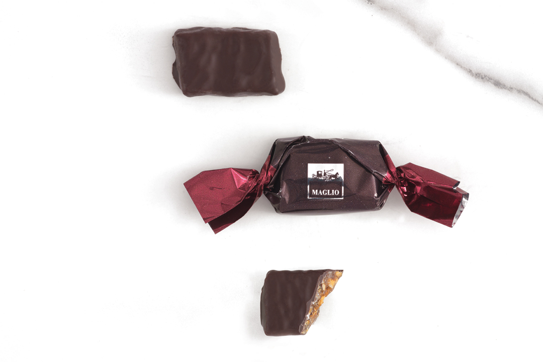 Croccantino, incarto bordeaux – Krokante chocolaatjes met amandelen uit Puglia, met suiker en honing bedekt met pure chocolade (3 kg)