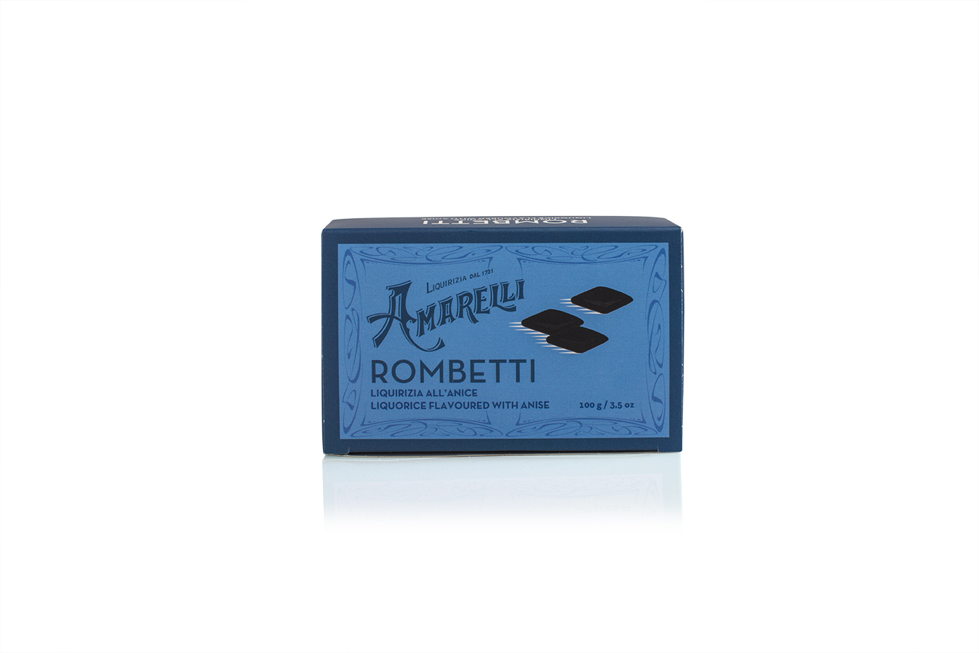ROMBETTI ALL’ANICE, piccoli rombi di liquiriza pura all’anice – Donkerblauw doosje met kleine brokjes pure drop met een anijssmaak (100 g)