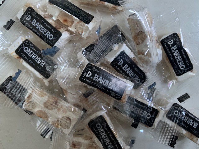 Scatola (rosa) con torroncini bianchi friabili con nocciole (100 g)