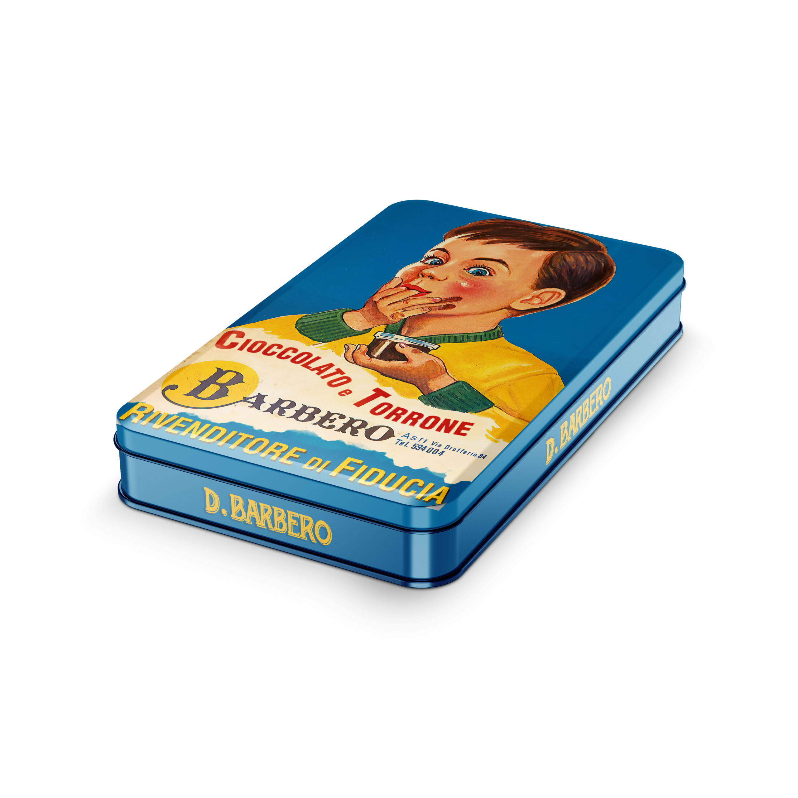 Het blauwe blik bevat de giandujotti classici, de giandujotti met pure chocolade, de giandujotti met nougatstukjes en de giandujotti met karamel.
