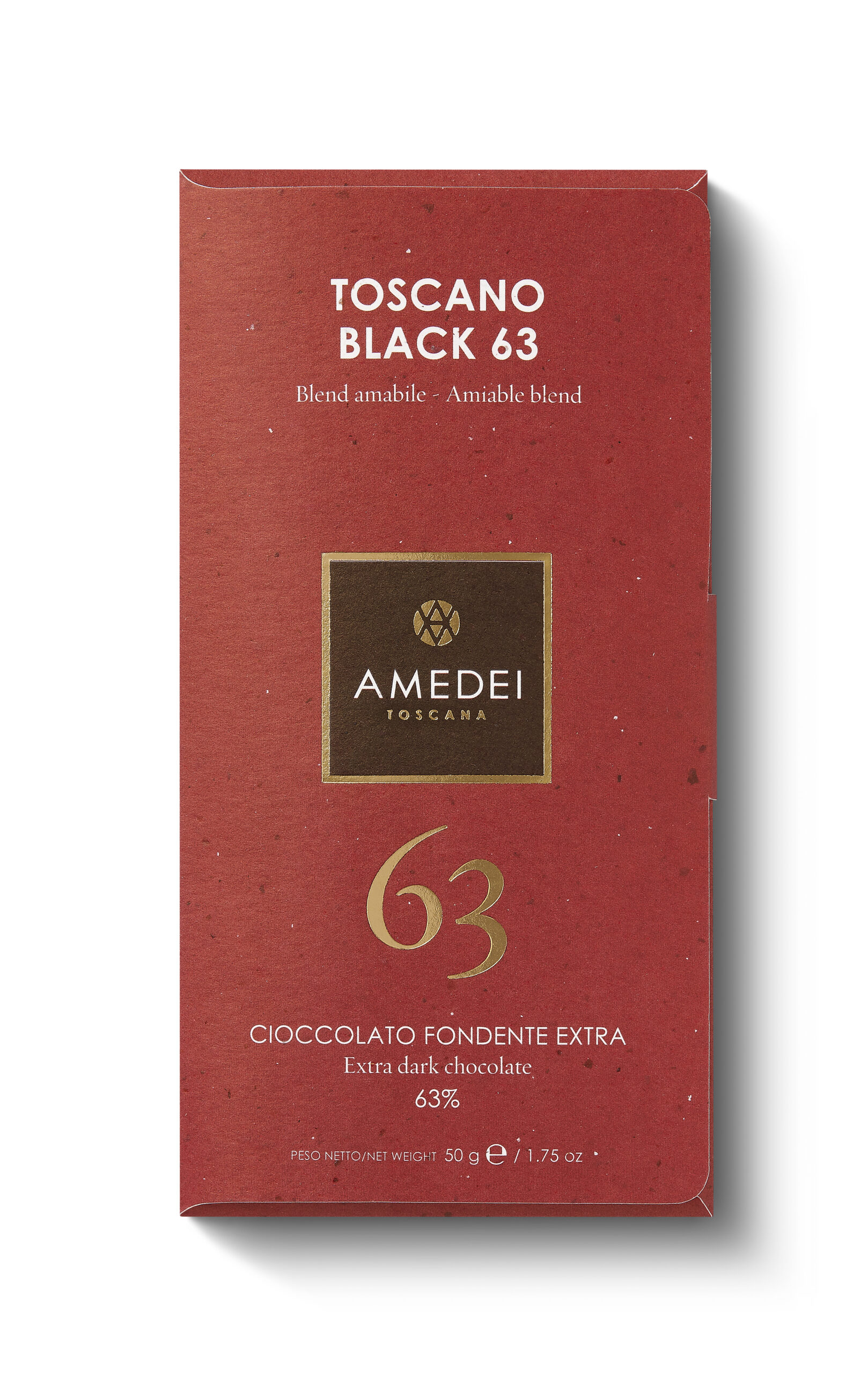 Amedei’s eerste overwinning van Gouden Boon van de Academy of Chocolate in Londen in 2008, Toscano Black 63, is een zoete blend, eerst gecombineerd met twee genetica van cacao uit Venezuela in Ghana. Een 63% pure chocolade met een volve, rijke, aanhoudende en romige smaak tegelijk.