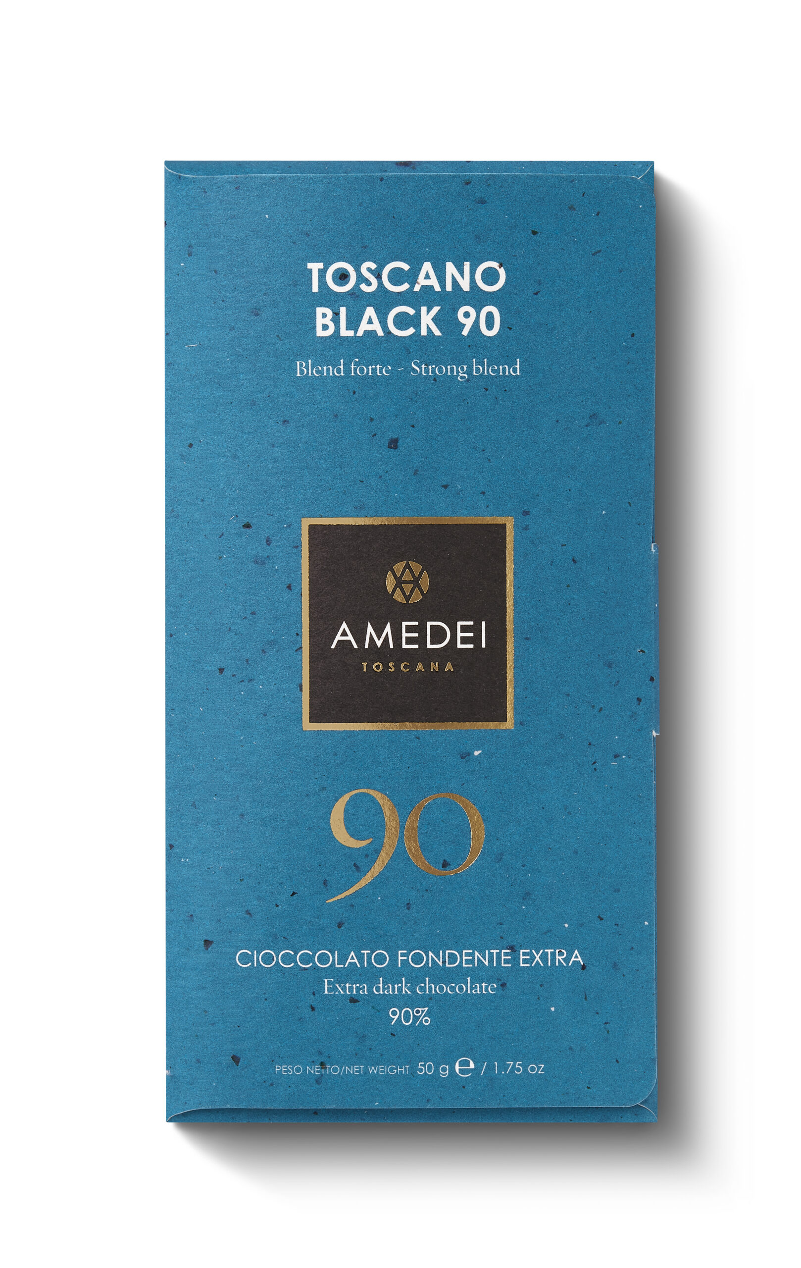 Toscano Black 90 – extra pure chocolade 90% Toscano Black 90, geboren in 2018 en derde uit Amedei’s lijn met pure chocolade. Het is een sterke blend, verkregen uit de combinatie van twee genetische kwaliteiten van cacao uit Madagaskar en Ghana. Een 90% pure chocolade gekenmerkt door een delicate en uitnodigende geur. Ondanks het hoge cacaopercentage is het een romige chocolade die in de afdronk een zeer zuiver gehemelte achterlaat.